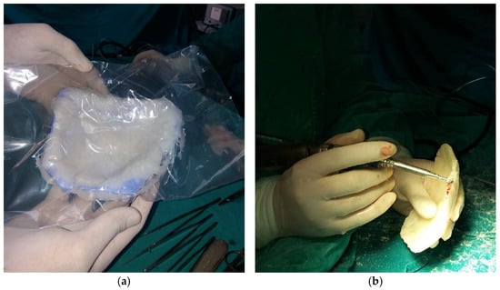 Intraoperative processing of the PMMA implant: (a) PMMA mass adapting using mold; (b) grinding and finishing of implant.
