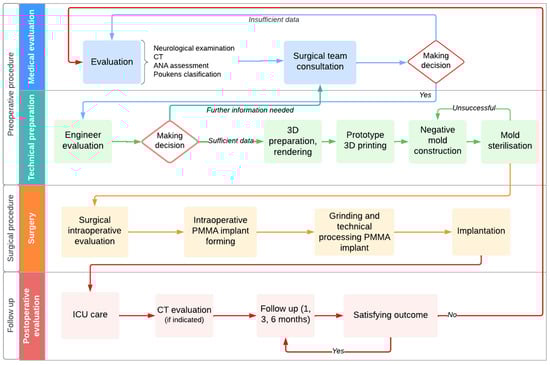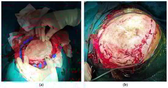 After preoperative steps and multidisciplinary collaboration, the surgical intervention begins (Figure 12). The procedure involves examining the defect, and modifying the PMMA mass with a sterilized mold []. Two approaches for PMMA implantation exist: preoperative fabrication (costlier and riskier) and intraoperative modification (more suitable for LIMCs, potentially lengthening surgery) [,]. The average surgical duration for the presented cases was 135 min [,]. Following modification, the PMMA implant is placed over the bone defect and secured with silk sutures [,,]. Postoperative monitoring involves ICU care and neurosurgical oversight. CT scans are used if complications are suspected. Our cases had varying hospital stays, with no complications reported. Follow-ups are scheduled at one, three, and six months, including neurological and physical assessments, and aesthetic evaluation with the ANA scale.