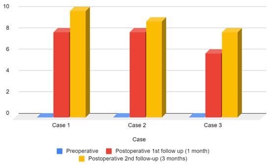 One month post-surgery, the ANA scores for Cases 1 and 2 increased to 8, indicating improved aesthetic satisfaction. Case 3 also demonstrated improvement, albeit to a lesser extent, with an ANA score of 6 (Figure 11). At the three-month follow-up, aesthetic outcomes continued to progress. Both Case 1 and Case 2 achieved higher ANA scores of 9 and 10, respectively, indicating further enhancement in their aesthetic appearance. Similarly, Case 3 exhibited continued improvement, attaining an ANA score of 8.