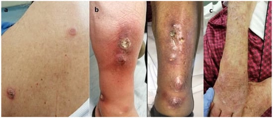 2. Santos, J.B.D.; Figueiredo, A.R.; Ferraz, C.E.; de Oliveira, M.H.; da Silva, P.G.; de Medeiros, V.L.S. Cutaneous tuberculosis: Epidemiologic, etiopathogenic and clinical aspects—Part I. An. Bras. Dermatol. 2014, 89, 219–228. [Google Scholar] [CrossRef] [PubMed]