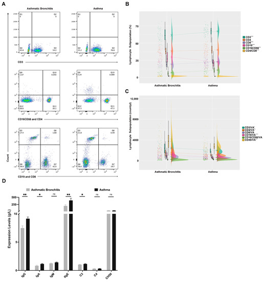 Lymphocyte subsets, immunoglobulin and complement levels in children with asthmatic bronchitis and asthma. (A) The representative flow cytometry analysis plots of lymphocyte subsets in children with asthmatic bronchitis and asthma (CD3+, CD4+, CD8+, CD16+CD56+, CD19+). (B) Percentage of lymphocyte subsets in children with asthmatic bronchitis and asthma. (C) Absolute count of lymphocyte subsets in children with asthmatic bronchitis and asthma. (D) Immunoglobulin and complement levels in children with asthmatic bronchitis and asthma. ns p > 0.05, * p < 0.05, ** p < 0.01, *** p < 0.001, **** p < 0.0001.
