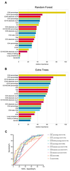 Due to the large variety of immunological biomarkers, we used RF and ET to rank and screen the importance of features (immunological biomarkers and demographic characteristics). As shown in Figure 2A,B, the importance of each feature in discriminating between asthma and asthmatic bronchitis is presented in descending order. Lymphocyte subsets, compared with immunoglobulins and complement, were more important for differentiating asthmatic bronchitis from asthma, especially CD19 percentage and absolute count, which rank high.