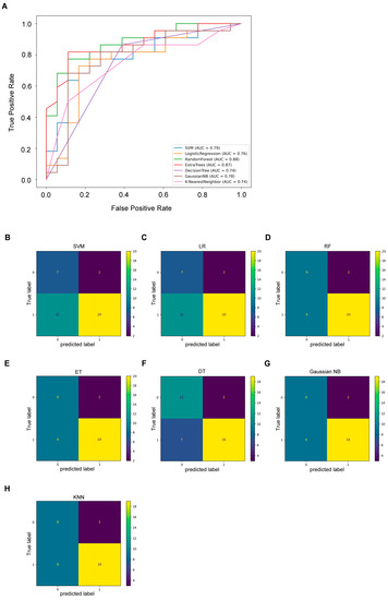 Model Testing. (A) ROC curve of seven models to differentiate asthmatic bronchitis from asthma. (B–H) Confusion matrix of seven models to differentiate asthmatic bronchitis from asthma. SVM = Support Vector Machine, LR = Logistic Regression, RF = Random Forest, ET = Extra Trees; DT = Decision Tree; KNN = K-Nearest Neighbor.