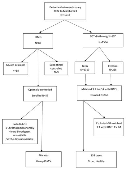 A prospective observational case–control study was conducted at a Level II NICU with an annual birth rate of 1500 infants in the County Hospital Mures, Romania from January 2022 to March 2023, comparing IDMs with a control group of non-IDMs. The size of the affected group was chosen by convenience [38 cases with gestational diabetes (G-DM) and 8 cases with pregestational diabetes (PG-D) Type 1 Diabetes Mellitus (T1DM)]. We matched the affected group 1:3 for gestational age to a group of low-risk pregnancies at the time of inclusion in the study (138 low risk pregnant women).