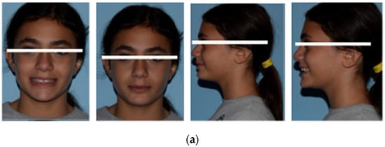 The pretreatment facial photographs showed a short facial pattern with reduced lower facial height, a symmetrical face, a slightly convex facial profile caused by maxillary prognathism, and a protrusive upper lip (Figure 1a).