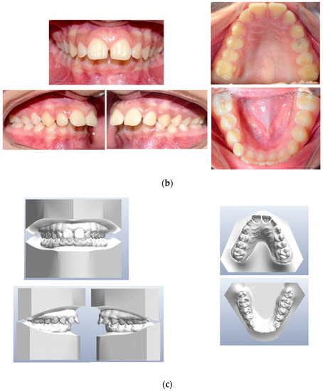 (a) Initial extraoral frontal smile–extraoral frontal rest and initial extraoral right profile photographs. (b) Pretreatment intraoral upper and lower occlusal image, right and left lateral photographs. (c) Pretreatment study models.