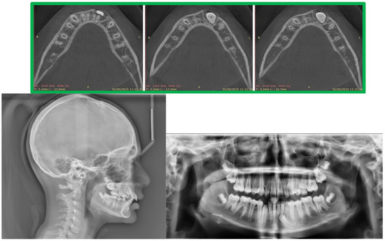 - Mupparapu, M. Patterns of intra-osseous transmigration and ectopic eruption of mandibular canines: Review of literature and report of nine additional cases. Dentomaxillofac Radiol. 2002, 31, 355–360. [Google Scholar] [CrossRef] [PubMed]