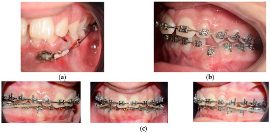 (a,b) The mandibular left canine was surgically exposed by using a laser. A bottom was placed labially near the tip of the cusp combined with a ligature without being sutured. (c) Intraoral views of treatment: 0.019 × 0.025 stainless steel wire upper and lower was inserted. The reverse pin to start class II biomechanics was placed on 13 and 23, with class II elastics (upper canines and first inferior molars) weighing 3/8 4.5 ounces.
