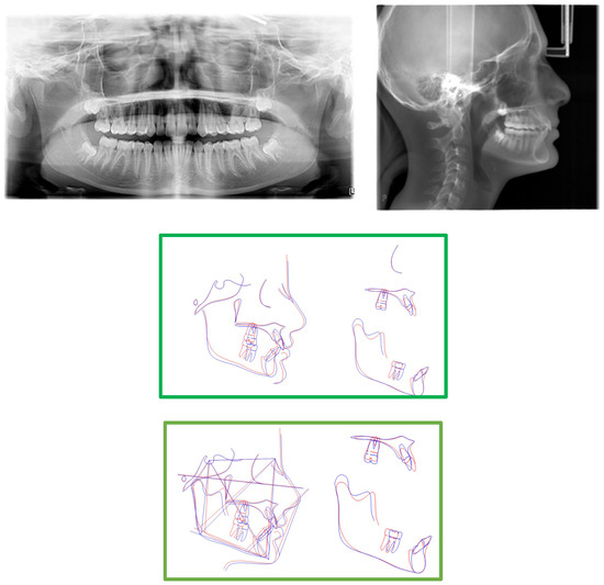 Post-treatment panoramic, cephalometric radiographs, tracing, and superimpositions. (Pre-treatment is is portrayed in blue, post-tretment is portrayed in red).