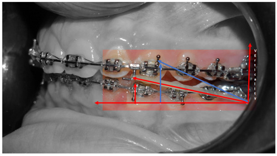 Janson et al. suggest that correcting class II malocclusion in an adult patient is possible with class II elastics, upper molar distalization, upper premolar extraction, and frontal teeth retraction using the multibrackets technique [34]. Treating class II malocclusion in adults without extractions can be challenging, requiring a well-personalized treatment plan with careful control of orthodontic mechanics to minimize side effects. In this patient, the superior part of the face was slightly protruded, while the lower jaw was well balanced. Class II elastics to bring the mandibular dentition forward were the preferred therapy [35]. However, according to Janson et al. [34], class II elastics may produce vertical and sagittal effects, such as extrusion of upper incisors, proclination of inferior incisors, loss of mandibular anchorage, and if we did not desire a mandibular post-rotation, are not indicated. To avoid mandibular post-rotation, the “Reverse Pin System” (Figure 7) was utilized. In this system, class II elastics were applied to the clamped pin in an occlusal direction to distance the application of force from the center of resistance of the lower molars and upper incisors, decreasing the side effects of extrusive forces [36]. This system optimizes the effect of class II elastics for correcting the molar and canine class while decreasing the vertical component of the elastic traction and, consequently, the post-rotation of the occlusal plane.