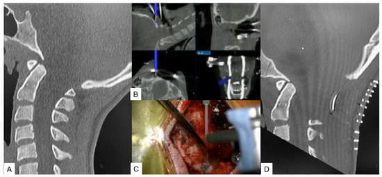 Case 2: 14-year-old female; Chiari malformation, foramen magnum decompression. (A) Preoperative occipitocervical CT sagittal reconstruction. (B) Intraoperative navigation image. (C) Intraoperative image. (D) Postoperative occipitocervical CT sagittal reconstruction.