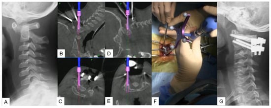 Case 3: 5-year-old male; Down syndrome, anterior atlantoaxial subluxation, modified Goel technique. (A) Preoperative lateral cervical radiogram. (B,C) Intraoperative navigation image of C2 pedicle screw insertion. (D,E) Intraoperative navigation image of C1 lateral mass screw insertion. (F) Intraoperative image. (G) Postoperative lateral cervical radiogram.