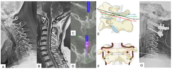 Case 4: 68-year-old male; anterior atlantoaxial subluxation, modified Goel fixation. (A) Preoperative cervical lateral radiogram. (B) Preoperative midsagittal T2 weighted MR imaging. (C) Intraoperative navigated high-speed burr. (D) Intraoperative lateral mass screwing. (E) Various C1 lateral mass entry points in lateral. (F) Insertion point of mid-point technique (red circle). (G) Postoperative cervical lateral radiogram.