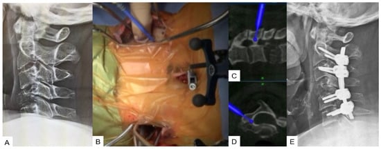 - Tanaka, M.; Fujiwara, Y.; Uotani, K.; Kadiri, V.; Yamauchi, T. C-Arm-Free Minimally Invasive Cervical Pedicle Screw Fixation (MICEPS): A Technical Note. Acta Med. Okayama 2020, 74, 551–556. [Google Scholar] [PubMed]