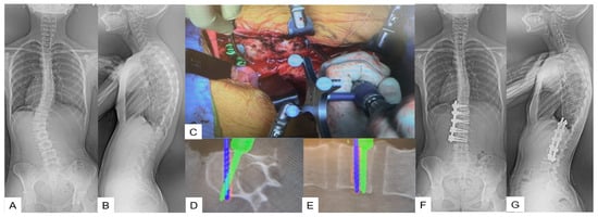 Case 6: 15-year-old female; adolescent idiopathic scoliosis LT11-L3enke Type 5C, T12-L3 anterior fusion. Preoperative 46 degrees of Cobb angle (T12-L3) became 1 degree. (A) Preoperative posteroanterior spine radiogram. (B) Preoperative lateral spine radiogram. (C) Intraoperative image. (D) Intraoperative axial navigation image. (E) Intraoperative coronal navigation image, (F) Postoperative posteroanterior spine radiogram. (G) Postoperative lateral spine radiogram.
