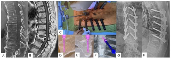 Case 8: 85-year-old male; T8 fracture of diffuse idiopathic skeletal hyperostosis (DISH) patient. (A) Preoperative sagittal reconstruction CT. (B) Preoperative sagittal T1 weighted MR imaging. (C) Intraoperative image. (D) Intraoperative sagittal navigation image. (E) Intraoperative axial navigation image. (F) Intraoperative 3D navigation image. (G) Postoperative anteroposterior radiogram. (H) Postoperative lateral radiogram.