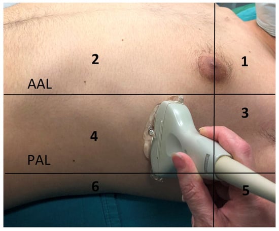 Divided regions of thorax for lung ultrasonography. AAL: anterior axillary line; PAL: posterior axillary line. 1. anterosuperior region, 2. anteroinferior region, 3. laterosuperior region, 4. lateroinferior region, 5. posterosuperior region, 6. posteroinferior region.