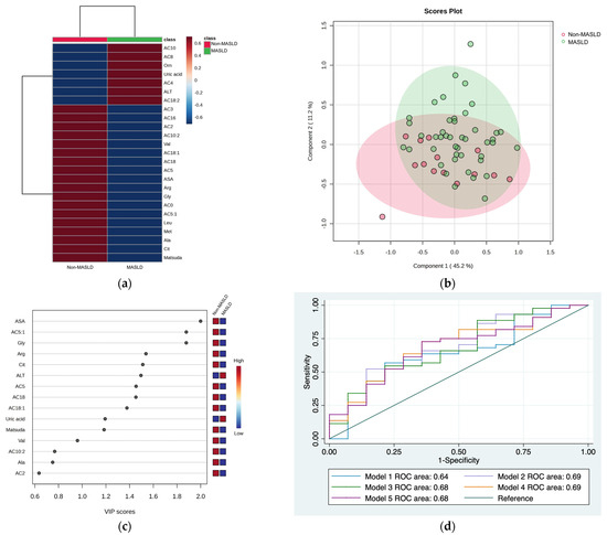 Serum metabolite and biochemical profile in children with MASLD. (a) Hierarchical heatmap for MASLD diagnosis, and the red and blue colors represent increased and decreased concentrations, respectively. (b) The PLS-DA plot shows the separation between groups (accuracy 0.69; R2 0.22; Q2 −0.20). (c) The VIP analysis represents the relative contribution of metabolites to the variance among groups (a high VIP score indicates a greater contribution of metabolites to the separation of the groups), and the red and blue boxes on the right indicate whether the metabolite concentration is increased (red) or decreased (blue). (d) Comparison of the ROC areas (Model 1: ASA + AC5:1 + glycine + arginine + citrulline; Model 2: Model 1 + ALT; Model 3: AC5:1 + glycine + arginine + citrulline + ALT; Model 4: AC5:1 + glycine + arginine + ALT; Model 5: glycine + arginine + ALT).