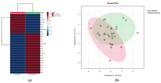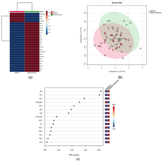Metabolite concentrations and biochemical data were median-normalized, square- or cube-root-transformed, and range-scaled. A partial least squares discriminant analysis (PLS-DA) was performed to identify the discrimination between study groups (non-MASLD vs. MASLD, non-MASLD vs. MASLD + fibrosis, and MASLD vs. MASLD + fibrosis). Variable importance projection (VIP) plots were graphed to visualize the metabolites that contributed the most to the discrimination of samples, and heatmaps based on the VIP scores were made to visualize the differences between the groups’ metabolite concentrations and biochemical data.