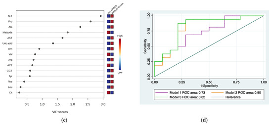 The hierarchical heatmap (Figure 2a) shows that children with MASLD + fibrosis had increased concentrations of phenylalanine, tyrosine, GGT, uric acid, proline, alanine, arginine, leucine, ornithine, carnitine, medium-chain acylcarnitine (AC8, AC10:2, AC6, and AC10), carnitine, ASA, ALT, and AST than children without MASLD. The MASLD and non-MASLD groups were separated into two clusters in the PLS-DA (Figure 2b). The metabolites and biochemical parameters that discriminated better between the study groups (VIP score > 1.5) were ALT, proline, alanine, Matsuda Index, and AST (Figure 2c). Based on the VIP scores, we tested three combinations of metabolites and biochemical data to select an MASLD phenotype (Model 1: ALT + proline + alanine; Model 2: ALT + proline + alanine + Matsuda Index; Model 3: ALT + proline + alanine + Matsuda Index + AST) (Figure 2d and Table 2). We further considered the ROC areas and a reduced number of metabolites while maintaining an adequate capacity to classify individuals. The inclusion of AST in Model 3 did not significantly improve the ROC curve; therefore, Model 2 was selected: Pr(y = 1|x) = 0.283 + 0.625 ALT + 1.07 Proline − 1.98 Ala − 2.98 Matsuda Index (ROC area = 0.80).