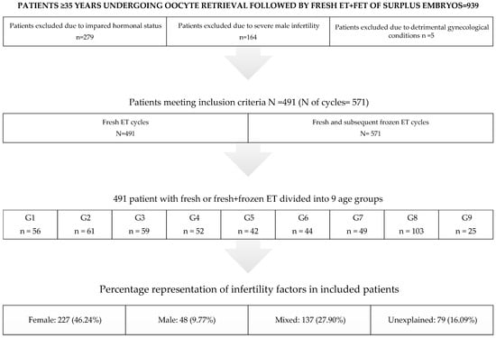 The study included women aged ≥35 years who underwent follicle aspiration followed by the fertilization of autologous oocytes and a fresh embryo transfer (ET), as well as the subsequent frozen embryo transfer (FET) of surplus vitrified embryos. In accordance with ESHRE (European Society for Human Reproduction and Embryology) recommendations, all patients referred to oocyte retrieval tested negative for COVID-19 []. Patients designated for the freeze-all strategy, donation, or preimplantation genetic testing (PGT) were not considered in this analysis, nor were patients with no mature (metaphase II) oocytes after retrieval or embryos for ET. Other exclusion criteria were impaired hormonal status, particularly anti-Müllerian hormone-AMH and follicle stimulating hormone-FSH (only patients with FSH < 15 mlU/mL and AMH > 0.5 ng/mL and <4.0 ng/mL were analyzed). Also excluded from the research sample was severe male infertility according to the WHO’s [] categorization (azoospermia, cryptozoospermia, surgically retrieved spermatozoa, necrozoospermia, <4% morphologically normal sperm cell according to Krüger criteria), as well as detrimental gynecological conditions such as polycystic ovary syndrome (PCOS), hydrosalpinx, severe endometriosis, and untreated uterine issues (septum, myomas, and polyps). The demographic characteristics of the study group selection process are given in Figure 1.