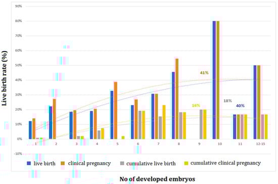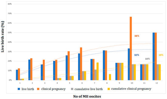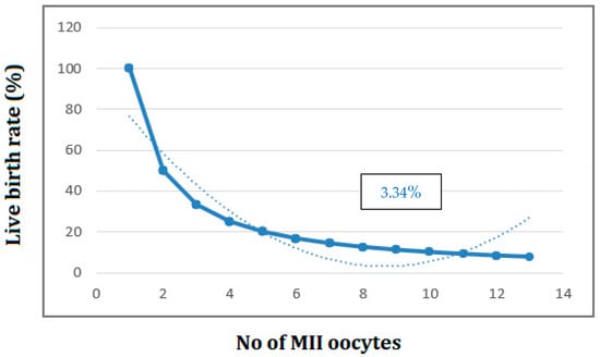 While concern for the optimization of oocyte or embryo yield rises, it is still unknown how many oocytes will optimize live birth rates and cumulative live birth rates at present []. This study showed similar results with other studies demonstrating that a larger number of oocytes and a generation of surplus cryopreserved embryos are associated with higher LBR and CLBR [,]. Contrary to previous published analysis which investigated the overall number of retrieved oocytes, our study enhanced the number of MII oocytes, given that the vast majority of retrieved oocytes were either immature or incapable of creating a good embryo []. In answer to a highly clinically relevant question, this study showed that the required number of MII oocytes and embryos for reaching an optimal LBR/CLBRis 10 MII/12 MII oocytes or 11/10 embryos in women aged ≥35. This outcome, when jointed with the disclosure that the highest CLBR per one oocyte was achieved when at least 9 MII oocytes were fertilized, is a potential prognostic tool for predicting IVF outcomes in women of advanced age.