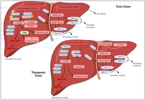 These highly hepatotoxic compounds are then rapidly detoxified by binding to reduced glutathione (via Glutathione-S-Transferase = GST) and then eliminated in the urine after conjugation with cysteine or mercapturic acid []. During an overdose, the mechanisms of detoxification by conjugation are overwhelmed, and the Paracetamol is mainly metabolized by the alternative route of Cytochrome P450 to NAPQI []. This massive production exceeds the elimination capacity by fixing glutathione via the GST []. There is, therefore, an accumulation of intrahepatocyte NAPQI, which binds to cytosolic proteins and leads to mitochondrial toxicity []. On the histological level, cell necrosis of the Centro-hepatocyte type appears, and on the clinical level, the signs of acute hepatitis occur. Many enzymes are involved in the metabolism of Paracetamol []. Genetic polymorphisms (SNP = single nucleotide polymorphism) or gene copy number repeats (CNV = copy number variation) could be responsible for variability in individuals’ sensitivity to Paracetamol, which induces the development of acute hepatitis at therapeutic doses or the presence of non-serious acute hepatitis at toxic doses (Figure 1) []. Glucuronide conjugation is the primary way of metabolizing Paracetamol; the transformation of Paracetamol into glucuronoconjugated Paracetamol (eliminable through the urine >> bile) []. The enzyme responsible for glucuronoconjugation is uridine 5′-diphospho-glucuronosyltransferase (UGT) []. There are many isoforms, but five are particularly more involved in the metabolism of Paracetamol: UGT1A1, UGT1A9, UGT1A6, and UGTB15 [].