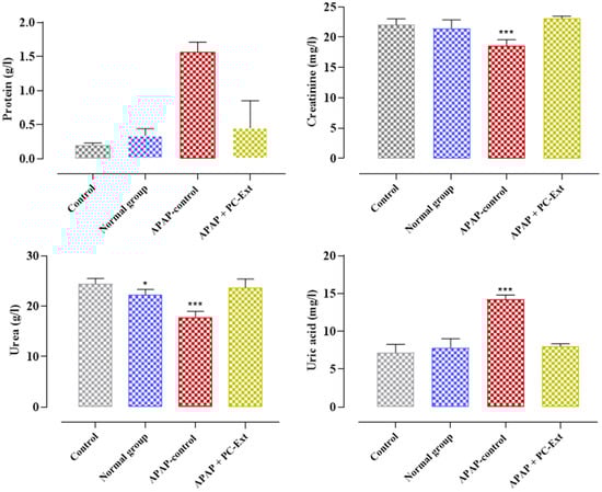 Effects of Paracetamol and PC-Ext on 24 h urinary excretion of total protein, creatinine, urea, and uric acid on day 15 after commencement of the intervention. Each value represents mean ± S.E.M. * p < 0.05, *** p < 0.001 as compared with the control group. Statistical analysis by two-way ANOVA followed by Dunnett’s multiple comparisons tests.