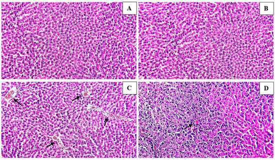 Effect of Paracetamol and/or PC-Ext on liver histopathology photomicrographs of liver sections stained with (H and E). (A)—The control group depicted normal histology of hepatocytes. (B)—Normal group shows no histopathological alteration and a normal histological structure. (C)—Paracetamol-only group treated rats showed significant hepatic injury as indicated by severe congestion and dilatation in the portal vein associated with inflammatory cell infiltration and edema in the periductal tissue surrounding the cystic dilated bile ducts. (D)—Paracetamol + Petroselinum crispum (200 mg/kg bwt)-treated rats observed maximum improvement with minimal congestion in the portal vein. (A–D; 20×; Scale bars: 100 μm).