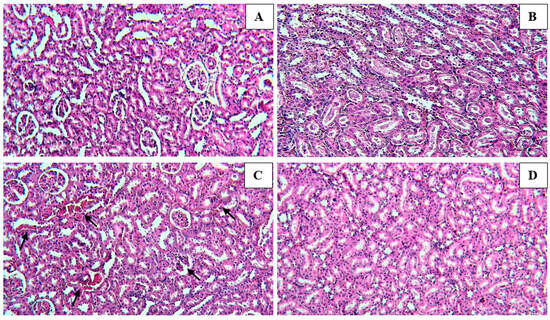 Histopathological changes of kidney sections after being treated with paracetamol and/or Petroselinum crispum stained with H & E. (A)—The control group revealed well-preserved tubular epithelial cells and the glomerular form of renal cells. (B)—The normal group revealed normal renal histology, similar to a normal control group. (C)—Paracetamol (200 mg/kg/day, p.o.)-treated rats exhibited massive inflammatory cell infiltration in the deteriorated renal tubules at the cortex, dilatation of the peritubular part, tubular degeneration, and vascular congestion. (D)—Paracetamol + PC-Ext (200 mg/kg bwt) treated rats; no histopathological alterations were recorded. (A–D; 20×; Scale bars: 100 μm).