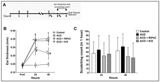 At 24 and 48 h post-challenge, ear thickness increased in the ACD group compared to the control group (Figure 1B, * p < 0.0001). RIPsC significantly reduced ear thickness compared to the ACD group at both 24 h and 48 h (Figure 1B, # p < 0.0001). In the ACD group, the number of scratches was not statistically significant (Figure 1C). RIPsC had no effect on the number of scratches (Figure 1B).