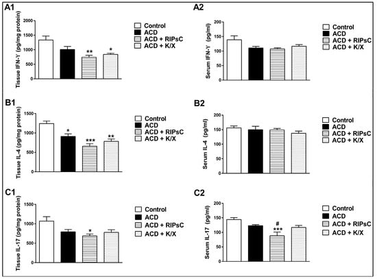 Ear tissue IFN-γ levels were significantly lower in the ACD + RIPsC and ACD + K/X groups compared to the control group at 48 h post-challenge (Figure 2A1, ** p < 0.001 and * p < 0.01, respectively). There were no significant differences in serum IFN-γ levels between groups at 48 h post-challenge (Figure 2A2).