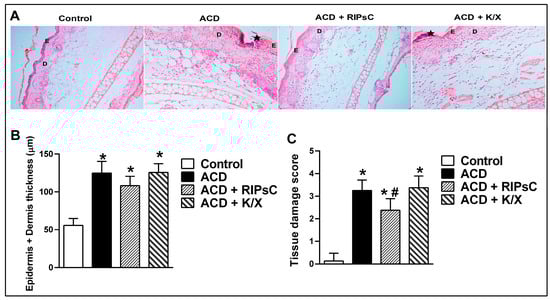 Tissue damage caused by ACD on H&E sections was scored according to histopathological findings, and the results are shown in Figure 3C. In all ACD groups (ACD, ACD + RIPsC and ACD + K/X), the tissue damage score was significantly higher than in the control group (Figure 3C, * p < 0.0001).