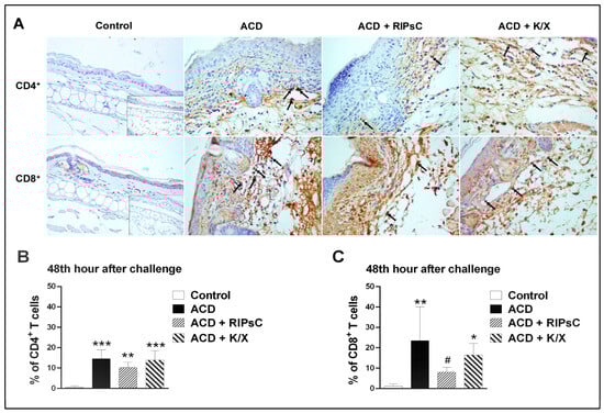 The CD4+ T cell counts of the groups are shown in Figure 4B and the CD8+ T cell counts are shown in Figure 4C. In all ACD groups (ACD, ACD + RIPsC, ACD + K/X), CD4+ and CD8+ cell counts in the dermal layer were significantly higher than in the control group (* p < 0.05, ** p < 0.001, *** p < 0.0001, respectively). Remote ischemic postconditioning decreased CD8+ T cell infiltration (Figure 4C, # p < 0.05).