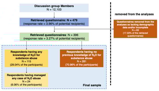 As shown in Figure 1, a convenience sample of 479 medical professionals (3.96% of the potentially eligible population) completed the questionnaire and participated in the survey. However, 83 questionnaires (17.33% of the initial sample) lacked demographic data and/or were incomplete and were therefore removed from the analyses. The final sample eventually included a total of 396 questionnaire (response rate = 3.27% of potential recipients). Overall, 115 participants (29.04% of the final sample) had any previous knowledge of N2O as a substance of abuse, and 24 (6.06%) had any previous personal experience in the management of N2O abuse cases.