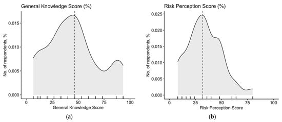 Density plots for: (a) knowledge score in 115 Italian physicians participating in the survey; (b) risk perception score (RPS). Both GKS (D’Agostino–Pearson’s normality test K2 = 5.747; p-value = 0.057) and RPS (K2 = 5.453; p value = 0.066) were somehow skewed and did not pass the normality check. Dotted line represents median value (46.67% and 32.0%, respectively).