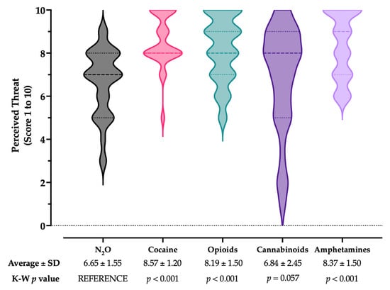 When asked to rate the perceived threat associated with N2O abuse cases, with a potential range 0 to 10, a score of 6.65 ± 1.55 was reported compared to 8.57 ± 1.20 for cocaine, 8.19 ± 1.50 for opioids, 6.84 ± 2.45 for cannabinoids, and 8.37 ± 1.50 for amphetamines (Figure 3). Assuming N2O as the reference group, estimates for cocaine, opioids, and amphetamines were substantially higher than that for laughing gas (p < 0.001), while the difference for cannabinoids was not statistically significant (p = 0.057).
