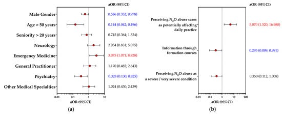 Forest plot for adjusted odds ratios (aOR) and their respective 95% confidence intervals (95%CI) for having any previous knowledge of N2O as an abuse substance (all participants, N = 396; subfigure (a)) and having previously managed any N2O abuse case (only participants having any knowledge of N2O as an abuse substance, N = 115, subfigure (b)).