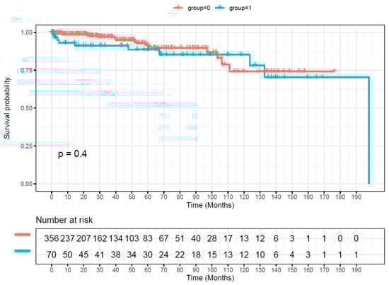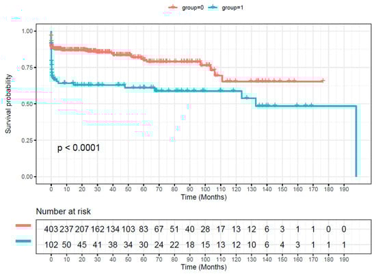 Kaplan–Meier curve showing our cohort’s overall survival after discharge (landmark point). Group 0 (red) = no mass transfusion. Group 1 (green) = mass transfusion.