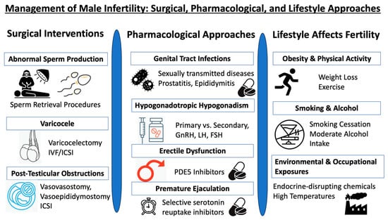 Triad of male infertility management: surgical, pharmacological, and lifestyle approaches.