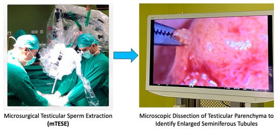 For non-obstructive azoospermia, mTESE is the preferred method. It is associated with higher sperm recovery rates (from 16.7 to 45% to 70.8%) and larger sperm counts, with 70 times less testicular tissue removed [,,]. Microsurgical procedures like mTESE are highly complex and should be performed only by an experienced, qualified urologist. A meta-analysis of 117 studies found no difference in the sperm retrieval rate (SRR) between mTESE and standard TESE []. SRR is positively correlated with a urologist’s case volume. There is a need for well-designed, adequately powered, randomized controlled trials to demonstrate the advantages of mTESE over standard TESE. Additionally, many patients with NOA should receive hormonal therapy and undergo careful monitoring of their gonadotropin levels [].
