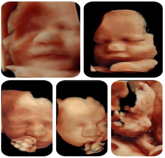 3D reconstruction of fetal face at different gestational ages. Except for the fetal profile showing the bulbous nose, the face appears normal.