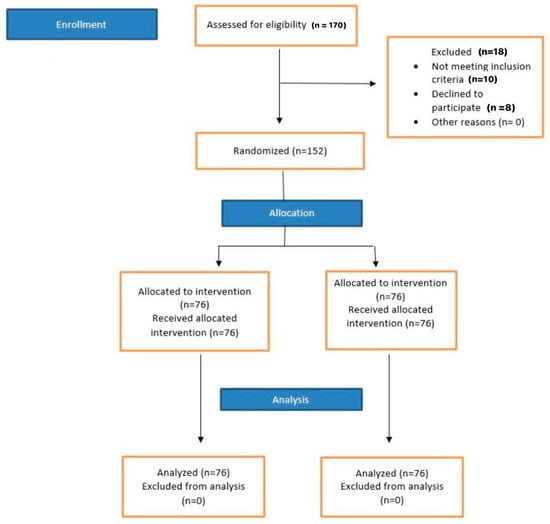 A total of 170 patients were initially assessed for eligibility. Out of those, 18 patients were excluded: 10 did not fulfill the criteria for inclusion and 8 refused to take part in the RCT. The final participant count for the trial was 152 with 98 males and 54 females. The participants were allocated randomly, to either the control or the experimental group (n = 76 each group), to assess the efficacy of the anesthetic agents under investigation.