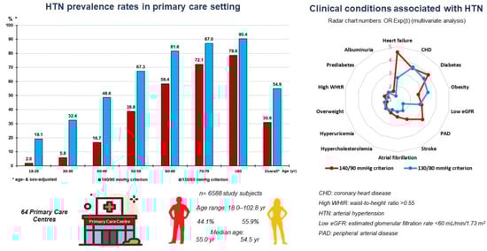 - The following comorbidities and clinical conditions showed, from greater to lesser intensity, an independent association with HTN according to both criteria: HF, DM, CHD, low eGFR, obesity, stroke, AF, hypercholesterolemia, hyperuricemia, high WHtR, prediabetes, and overweight. Albuminuria and PAD showed an independent association only with HTN according to the 140/90 criterion.