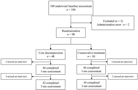 Participants who met the inclusion criteria were randomized into one of two treatment groups at a 1:1 ratio: the core decompression group and the conservative treatment group. The time from fracture to randomization was less than one month. Web-based randomization was employed to achieve concealed allocation. All participants were evaluated for the efficacy and safety of the treatment over a 3-month study period.