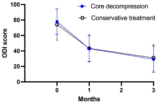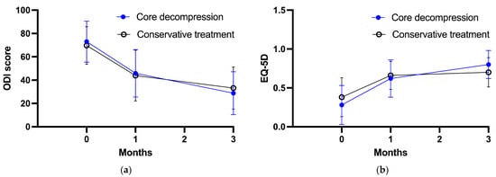 Figure 3 shows the changes in the secondary outcomes over the course of the follow-up period in both groups. The baseline ODI scores for the core decompression group and the conservative group were 73.0 ± 17.6 and 69.7 ± 16.1, respectively. After 1 month of treatment, the ODI scores were 45.9 ± 20.4 for the core decompression group and 43.9 ± 21.8 for the conservative group. At the 3-month follow-up, the ODI scores showed further improvement, with values of 28.8 ± 18.4 for the core decompression group and 33.2 ± 18.1 for the conservative group. As for the EQ-5D scores, at baseline, the core decompression group scored 0.28 ± 0.25, while the conservative group scored 0.38 ± 0.25. After 1 month of intervention, the EQ-5D scores were 0.62 ± 0.24 for the core decompression group and 0.66 ± 0.18 for the conservative group. At the 3-month follow-up, the EQ-5D scores had improved further, reaching 0.80 ± 0.18 for the core decompression group and 0.70 ± 0.19 for the conservative group. The RM-ANOVA results indicated no significant intergroup differences in the ODI and EQ-5D scores (p = 0.917 and p = 0.704, respectively). This indicates that the ODI and EQ-5D scores did not differ significantly between the core decompression and conservative treatment groups throughout the follow-up period.