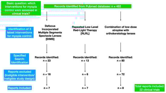 | Search terms used: | DIMS AND myopia control, Orthokeratology AND atropine AND myopia control, low-level red-light therapy AND myopia control. |