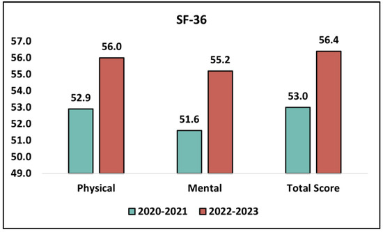 From a psychological standpoint, the decline in the anxiety about returning to in-person learning from 2020–2021 to 2022–2023 suggests that students became more accustomed to the “new normal” and possibly felt more prepared or less apprehensive about returning to physical classrooms, as recent studies suggested [35,36]. The variations in health status, quality of life, and anxiety symptoms further solidify this interpretation. However, it is essential to also consider how external factors, like the broader societal acceptance and adjustment to post-pandemic conditions, might have influenced these positive shifts in mental health metrics. Moreover, the significant improvement in the SF-36 scores from 2020–2021 to 2022–2023 denotes an enhancement in both physical and mental health. The notable decrease in the GAD-7 scores in 2022–2023 compared to 2020–2021 is also indicative of reduced anxiety symptoms [37].