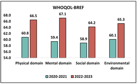 In the social domain, students’ scores rose from a mean of 58.9 (SD = 17.5) in 2020–2021 to 64.2 (SD = 13.5) in 2022–2023. This increase, while indicating a possible improvement in social interactions and relationships, was not statistically significant as the p-value was 0.123. Lastly, the environmental domain, which encompasses factors like financial resources, freedom, safety, and health and social care accessibility, showed an upward trajectory in scores from 60.1 (SD = 13.8) in 2020–2021 to 65.3 (SD = 15.9) in 2022–2023. However, this rise was not statistically significant with a p-value of 0.110, as described in Table 4 and Figure 2.