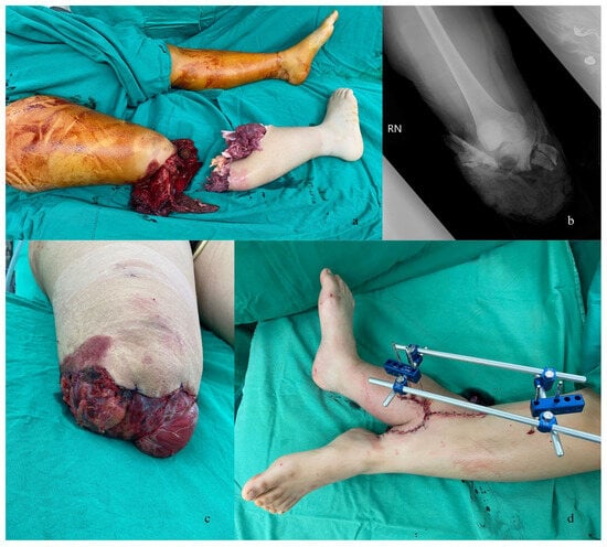 A 19-year-old healthy female had a motorbike accident in which she slipped and suffered from a complete below-knee amputation (Figure 1a,b). She was immediately taken to the emergency department. Upon arrival, she had a Glasgow Coma Scale score of 15, and her initial examination revealed cardiovascular stability.
